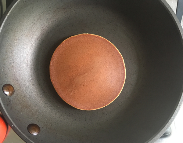 - Con un mestolo o un cucchiaio versare l’impasto sulla padella come un disco (tipo pancake) di circa 8cm di diametro, cuocerlo sempre a fuoco basso fino a quando si vedono le bolle sulla superficie, poi rovesciarlo e cuocerlo ancora per circa 1 minuto. Toglierlo dalla padella e disporrerlo su un piatto. Lasciare raffreddare