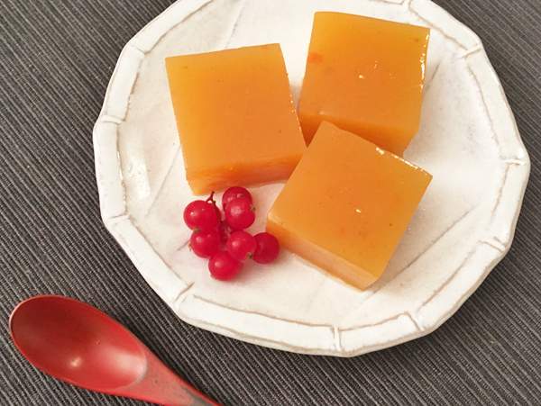 E’ un dessert fatto come gelatina con i kaki maturi tipo fuyu, per gelificante si utilizza il kanten o l’agar agar in polvere.