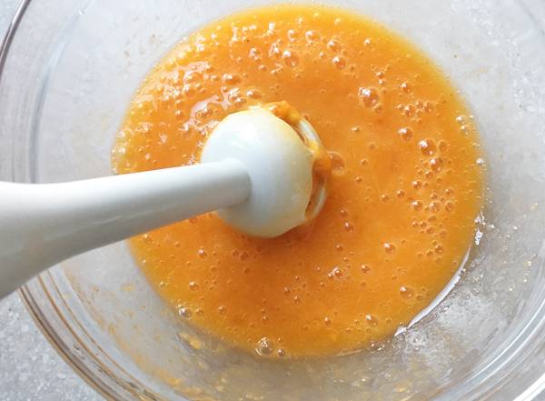 - Frullare la polpa di kaki col minipimer per spezzettare la parte solida, oppure filtrare con un colino