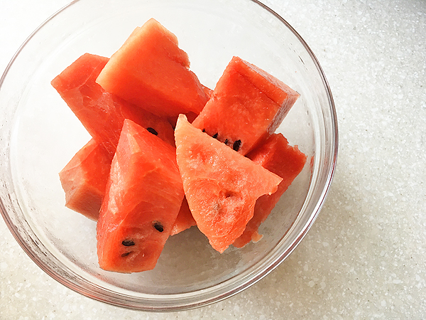- Tagliare la polpa di anguria a cubetti e eliminare i semi finché possibile