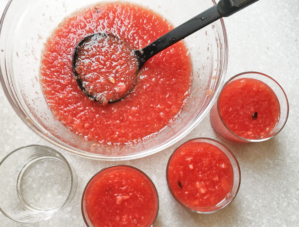 - Tritare o frullare i cubetti di anguria utilizzando il tritatutto o il frullatore (meglio se non troppo fine). Mettere il frullato in una coppa