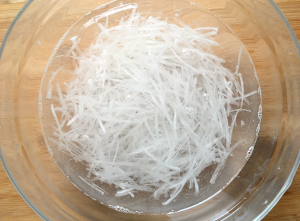 2. Tagliare il daikon a julienne e immergerlo nell’acqua fredda per qualche minuto, poi scolarlo e sgocciolarlo bene