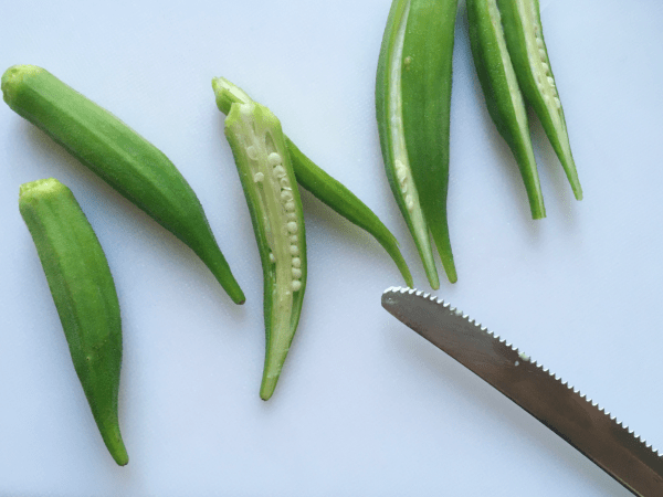 - Pulire l’okra, eliminare la parte dura del picciolo con un coltello facendo attenzione di non bucare il baccello