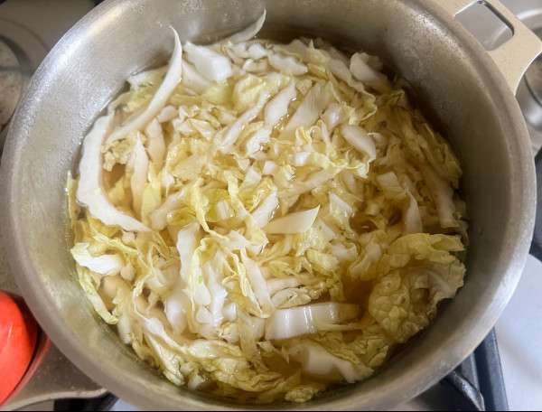 - Mettere le fettine di cavolo cinese nella pentola del brodo bollente e cuocerli a fuoco medio